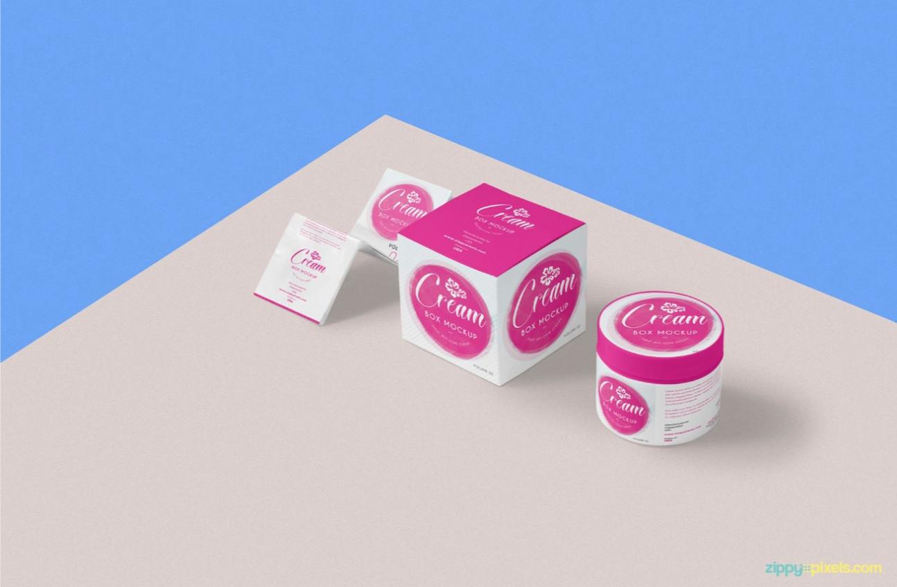 This mockup psd is well layered and organized so that you can customize each and every aspect of the templates according to your need. Change the color of the background presentation according to your need. Also check cosmetics jar on stone mockup and front view cream jar mockup.