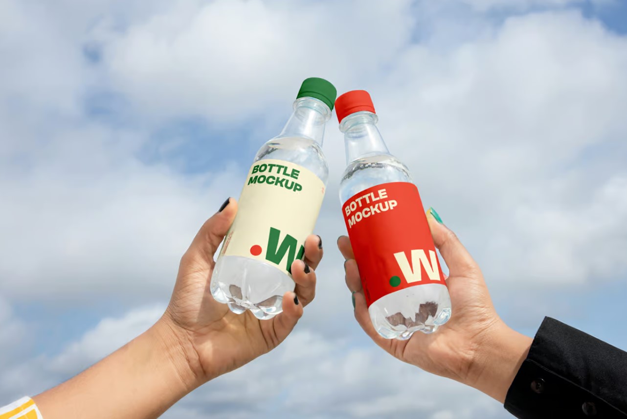This is a high quality two water bottles mockup psd that allows you to check the labeling designs in a professional way. You can replace the branding designs on the labels easily by using the smart layers feature of the files. You can replace the designs on the labels individually by using the layers. Any labeling designs placed on the bottles will get adjusted to the shape of the according to your need. The clear sky of the presentation background will give a professional and realistic look to the presentations. Use these mockups for designing unique social media posts and website banner for your clients. You can download the file for free and use for personal presentations.